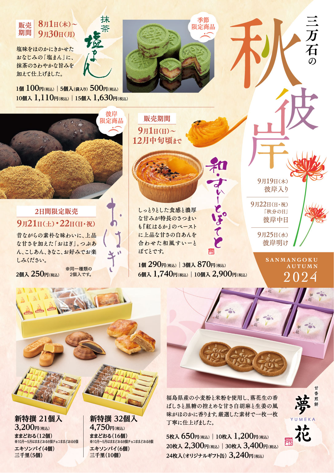 三万石では9/21(土)・9/22(日・祝)の2日間限定で「おはぎ」を3種類(こしあん・つぶあん・きなこ)ご用意いたしました。